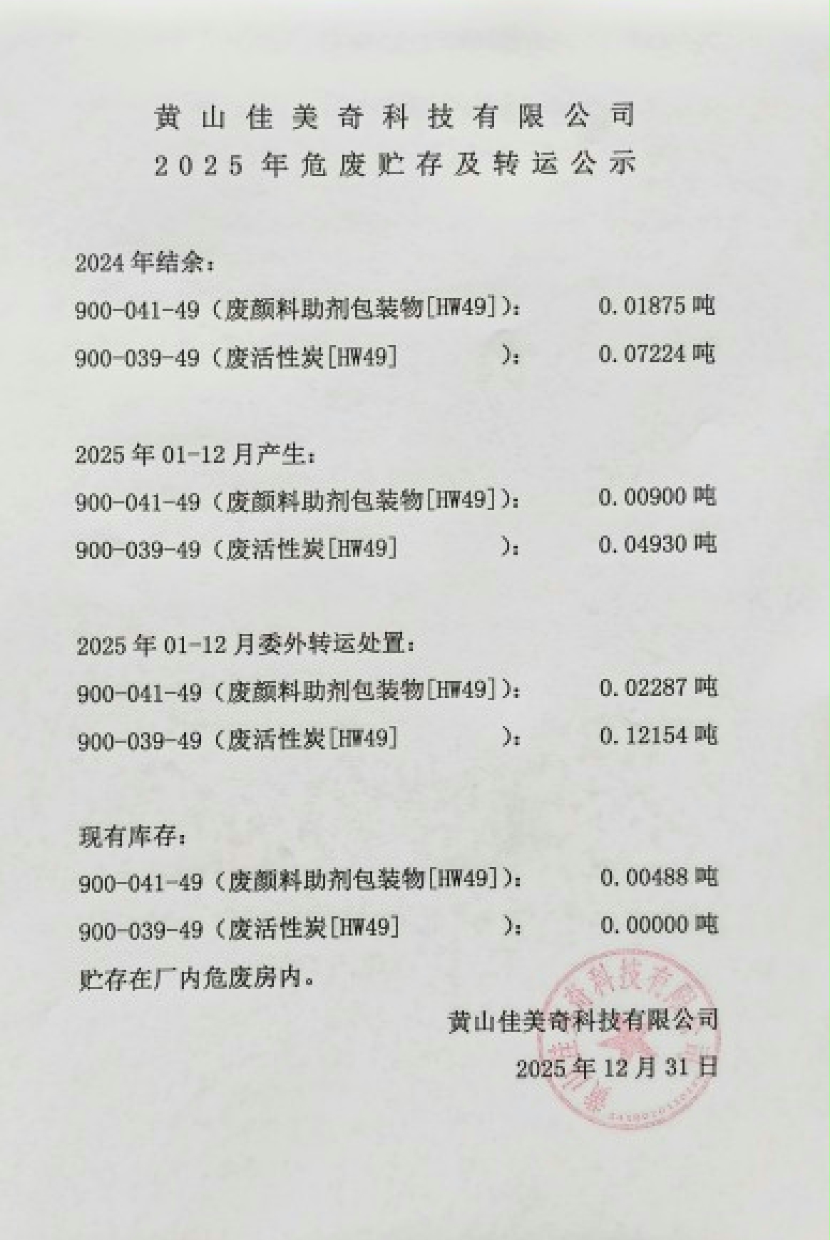 2025年危废贮存及转运公示